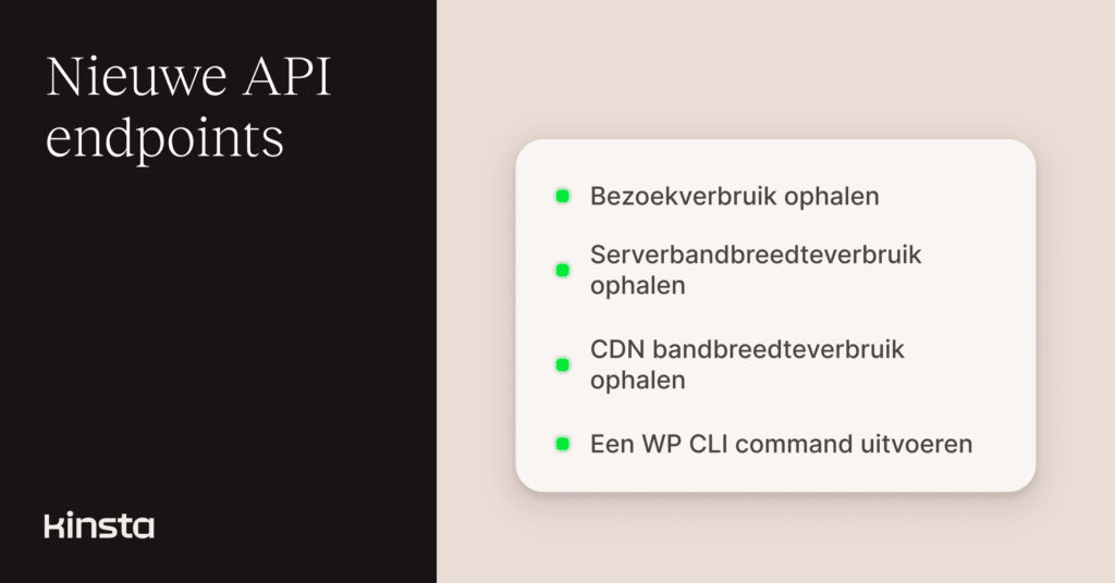 Het bijhouden van het resourceverbruik van je website en het automatiseren van WordPress bewerkingen is nu nog eenvoudiger. Deze update introduceert nieuwe endpoints voor het ophalen van actuele maandelijkse gebruiksgegevens en het rechtstreeks uitvoeren van WP-CLI commando’s via de Kinsta API.