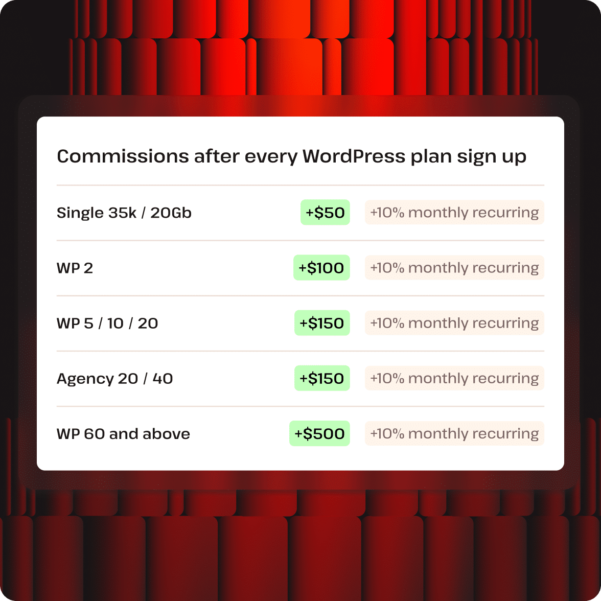As a Kinsta affiliate, you can earn significant one-time bonuses and monthly recurring commissions on every new customer you refer. No fees for you, only rewards.