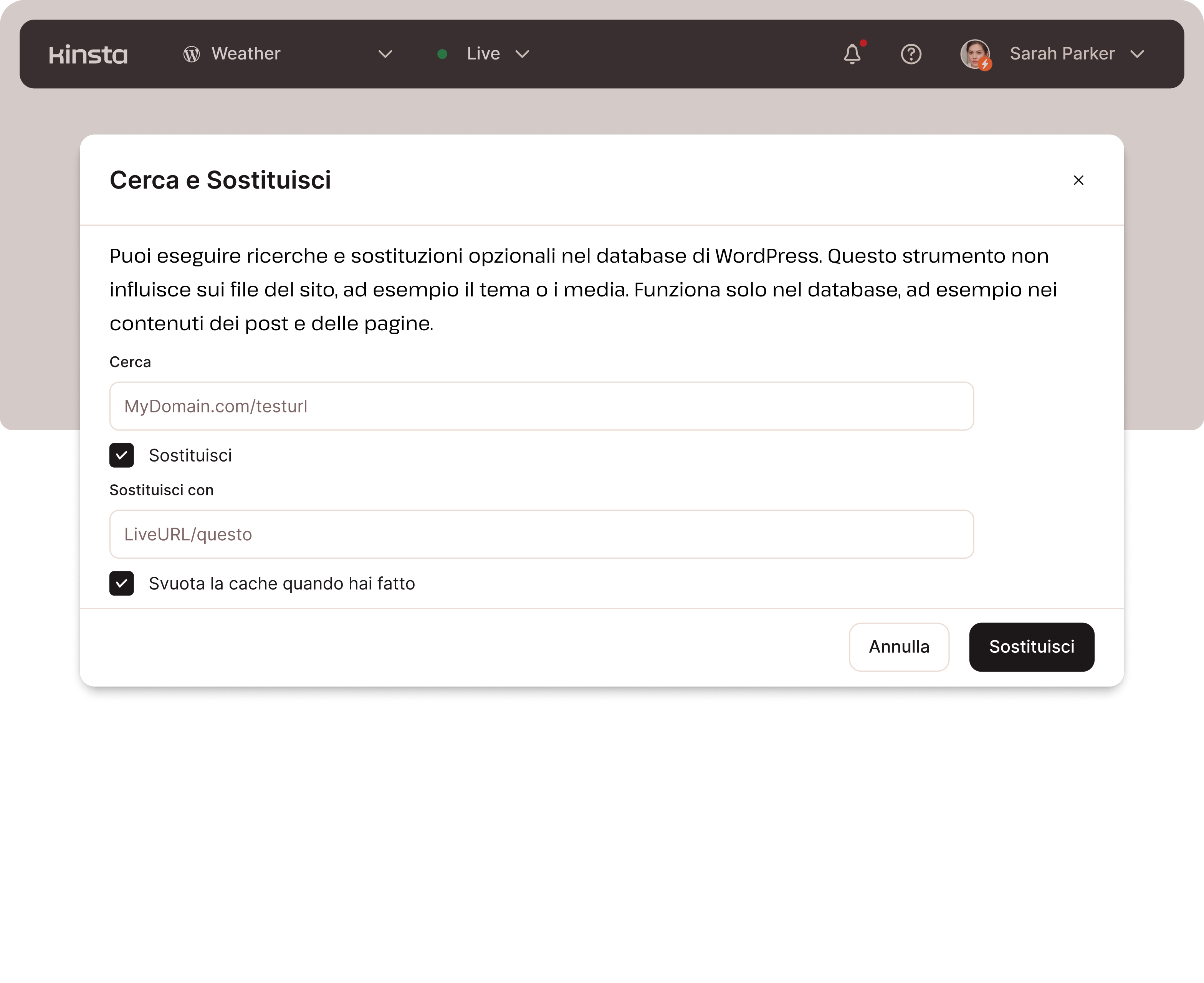 - Aggiornamento di plugin/temi direttamente da MyKinsta