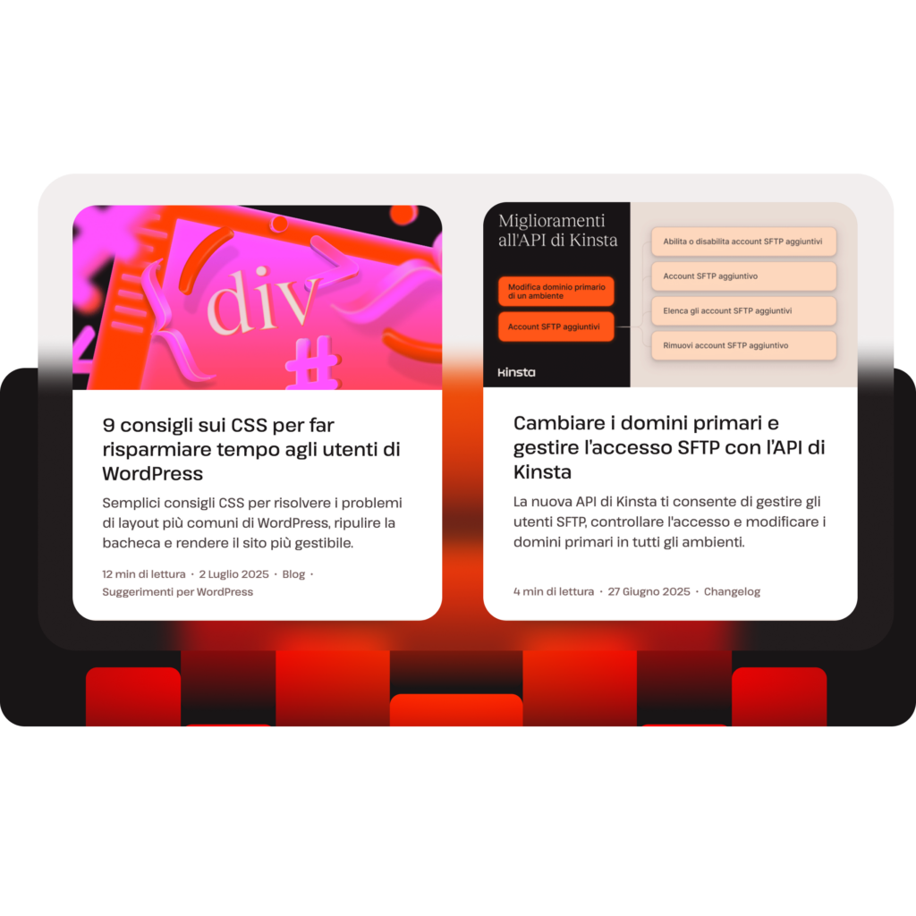 L’hosting gestito per WordPress di Kinsta è la soluzione perfetta per agenzie, aziende, e-commerce, sviluppatori, siti ad iscrizione, LMS e molto altro. Tutti i piani offrono un’infrastruttura veloce e sicura, CDN globale, Edge Caching, 27 data center, incluso uno a Milano, supporto esperto 24/7 in italiano e funzionalità di livello enterprise.