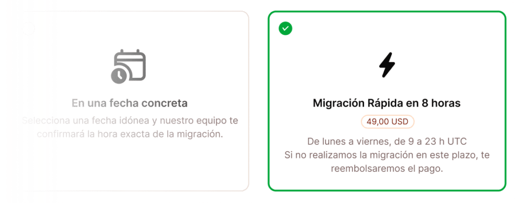Acelera tu solicitud de migración con nuestra opción de Migración Rápida. Si eliges esta opción, tu solicitud se procesará primero, dándole prioridad sobre otras migraciones. Elígela directamente en MyKinsta… ¡es muy cómodo!
