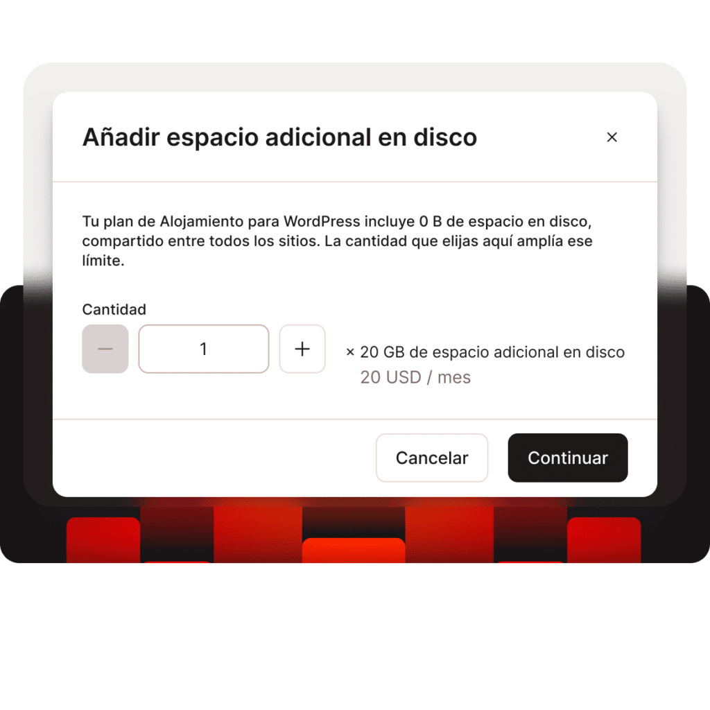 Incrementos de 20 GB a 20 $/mes por plan de alojamiento