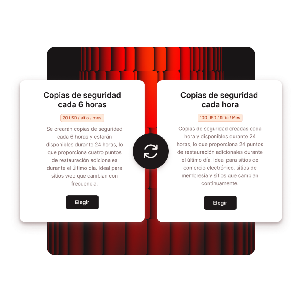 Copias de seguridad de 6 horas – $20 / Sitio / MesCopias de seguridad por hora – $100 / Sitio / Mes