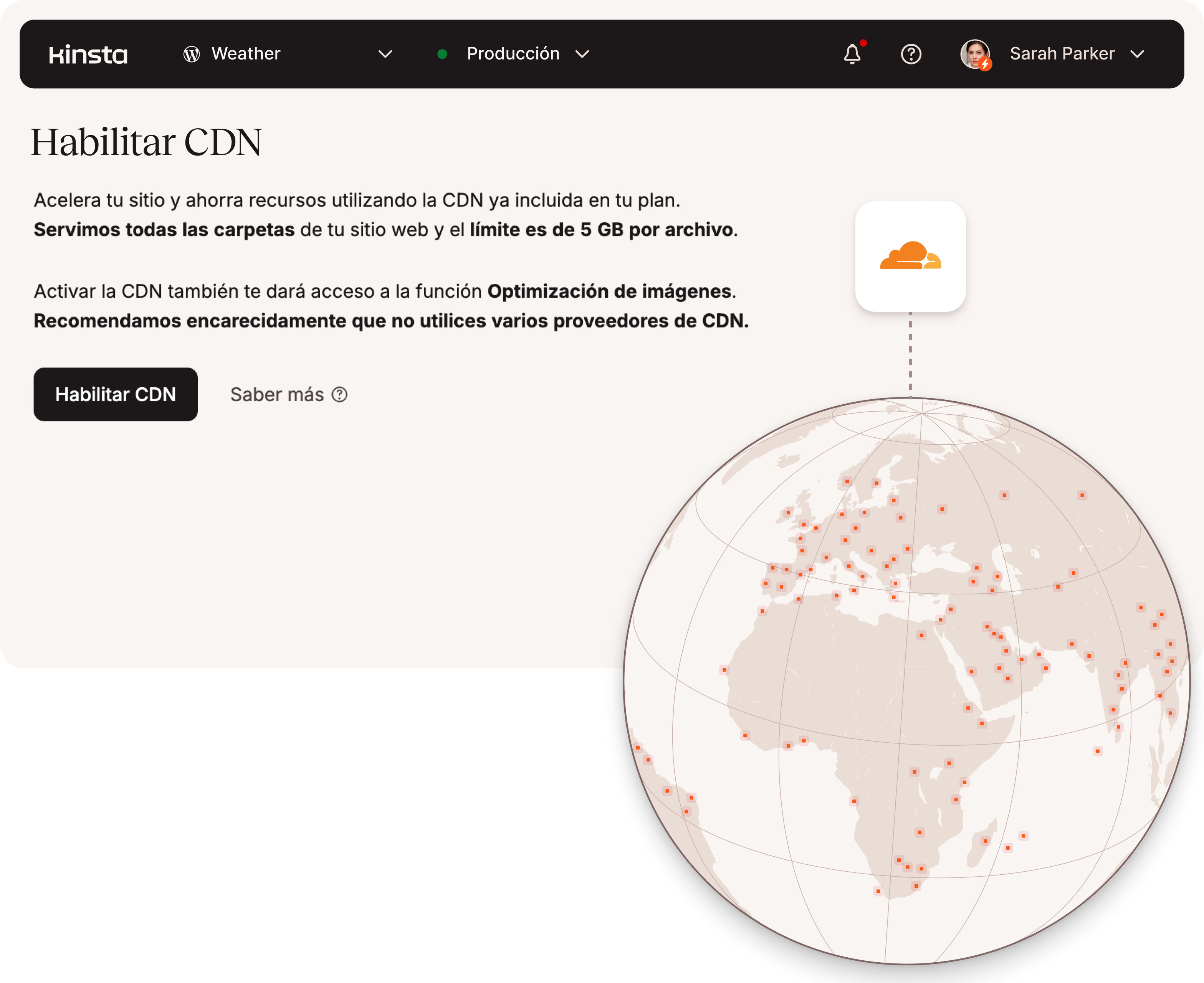 Todos los planes incluyen la CDN de Kinsta, una red de entrega de contenidos de alto rendimiento impulsada por Cloudflare con 300 POPs para acelerar la entrega de tus activos en todo el mundo. Incluimos ancho de banda gratuito en todos nuestros planes.