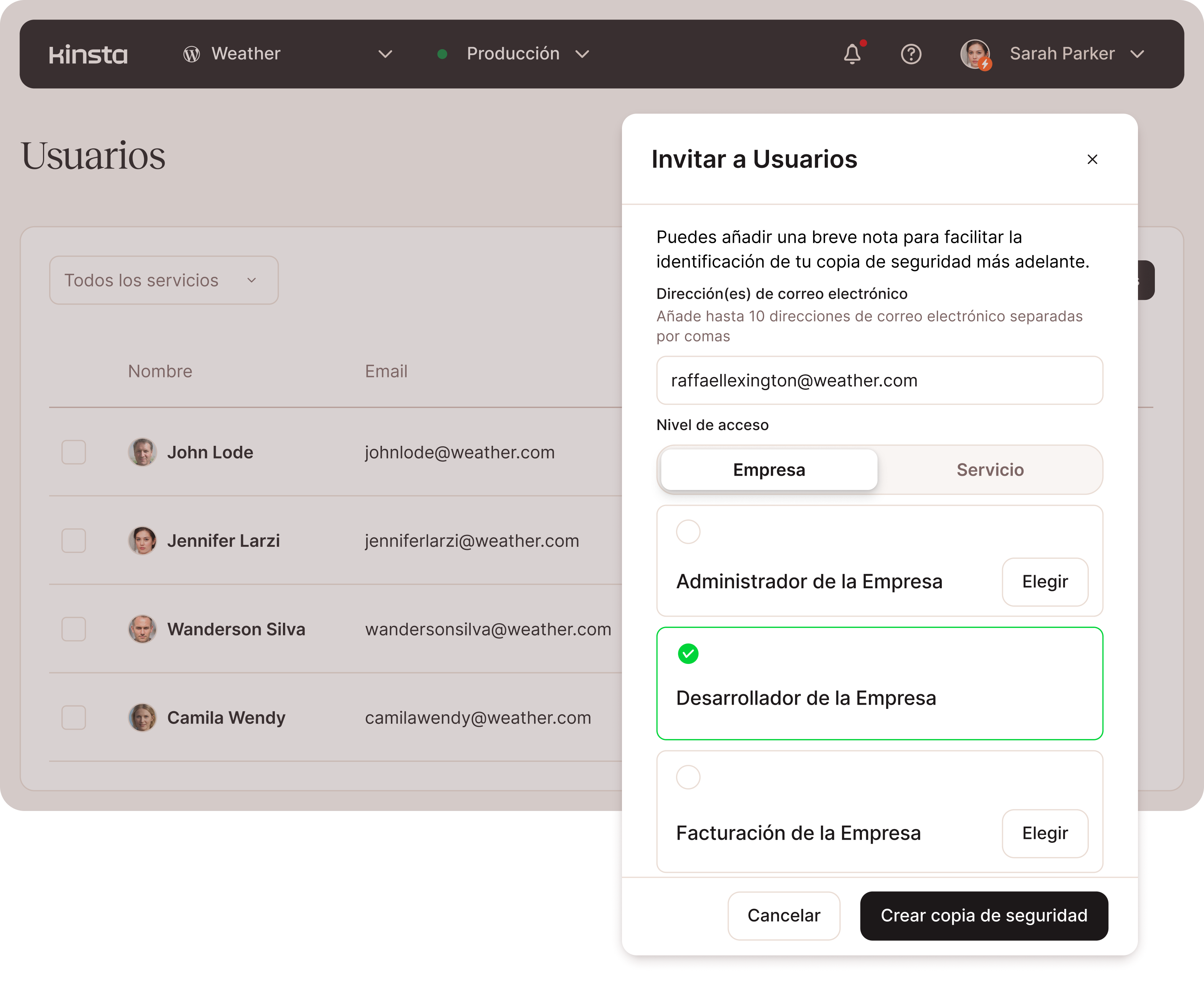 Añade un número ilimitado de usuarios y configura sus niveles de acceso con nuestra funcionalidad multiusuario. Concede acceso a distintos niveles, ya sea a todos los sitios de tu red o a un área específica como «facturación». Define los roles de los usuarios de MyKinsta a nivel de empresa y de sitio.