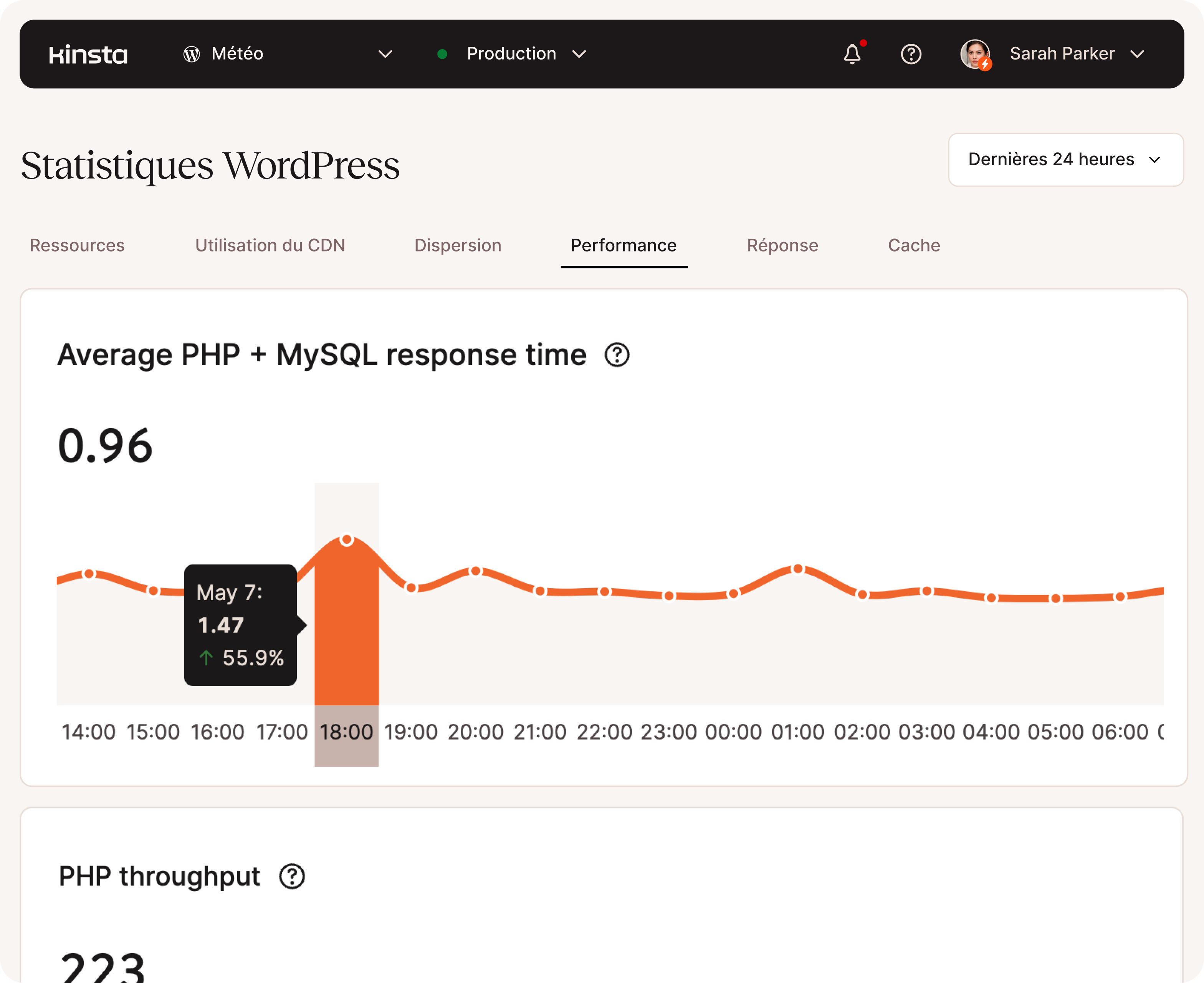 Avec notre tableau de bord MyKinsta, vous pouvez créer de nouveaux sites, gérer les domaines et les DNS, accéder aux sauvegardes, et analyser le trafic du site, l’utilisation de la bande passante, les mesures de performance, et plus encore.