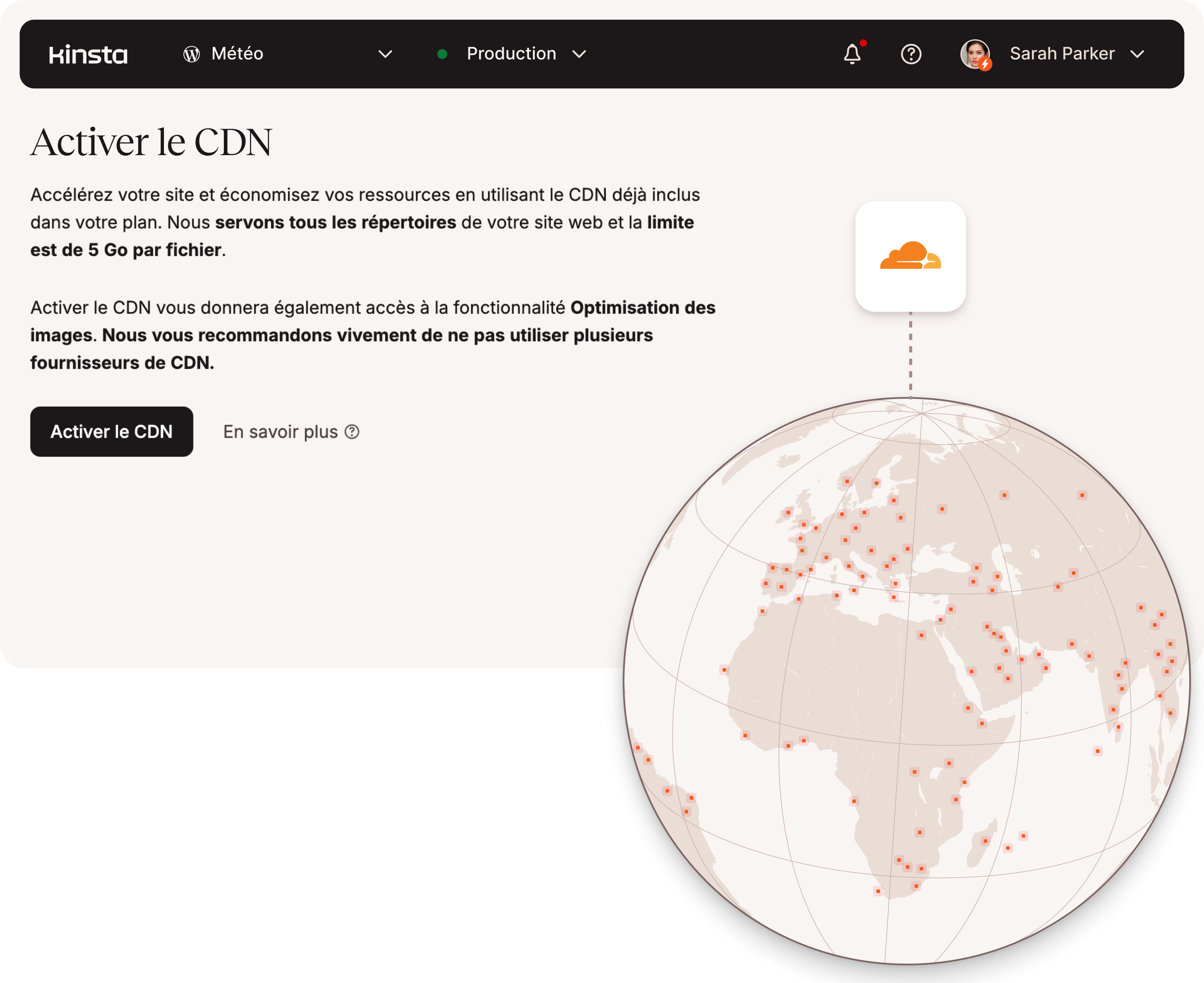Tous les plans incluent le CDN de Kinsta, un réseau de diffusion de contenu haute performance alimenté par Cloudflare avec 300 POP pour accélérer la diffusion de vos ressources dans le monde entier. Nous incluons une bande passante gratuite dans tous nos plans.