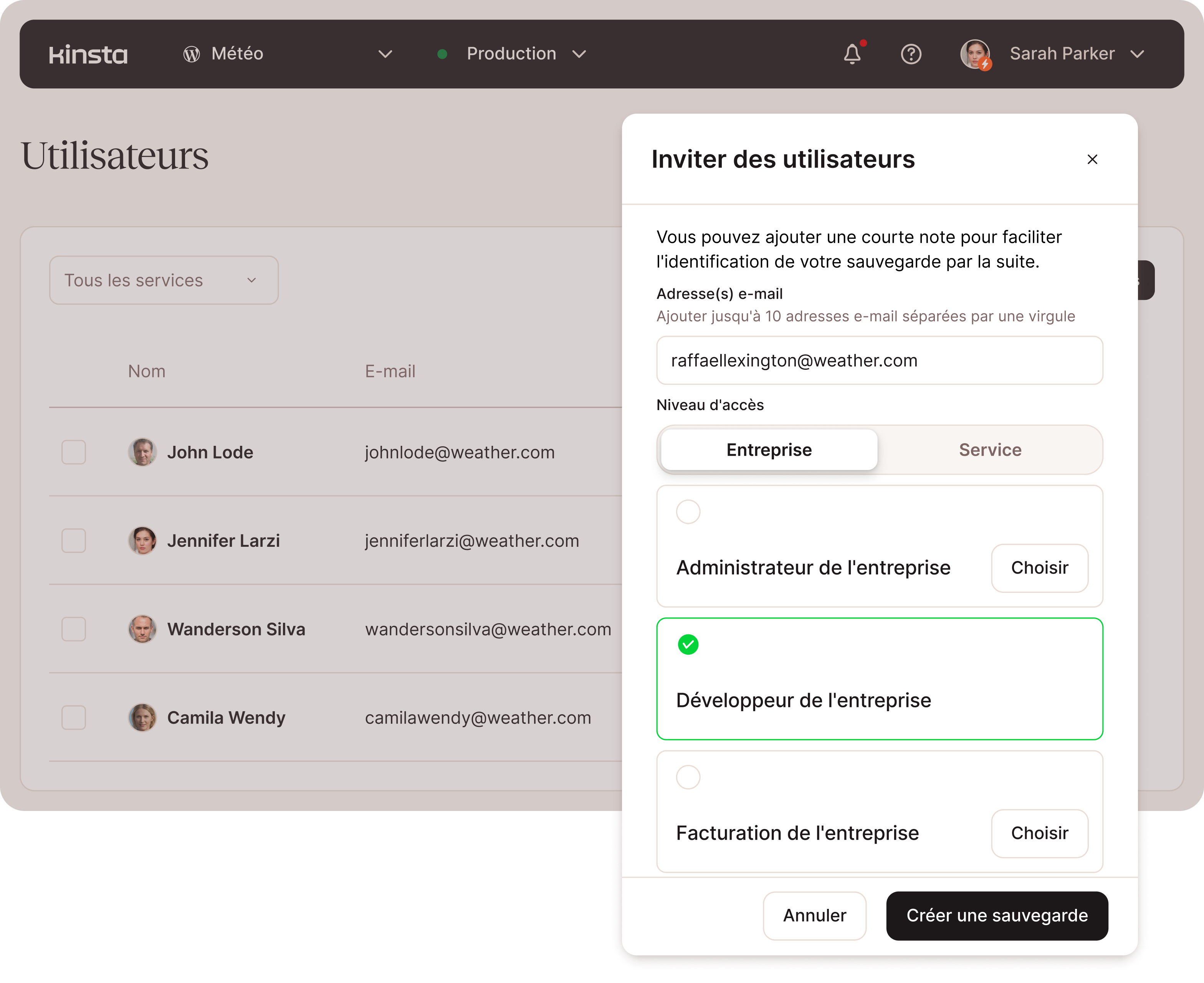 Ajoutez un nombre illimité d’utilisateurs et configurez leurs niveaux d’accès grâce à notre fonction multi-utilisateurs. Accordez des accès à différents niveaux, que ce soit à tous les sites de votre réseau ou à un domaine spécifique comme la « facturation » Définissez les rôles des utilisateurs MyKinsta au niveau de l’entreprise et du site.