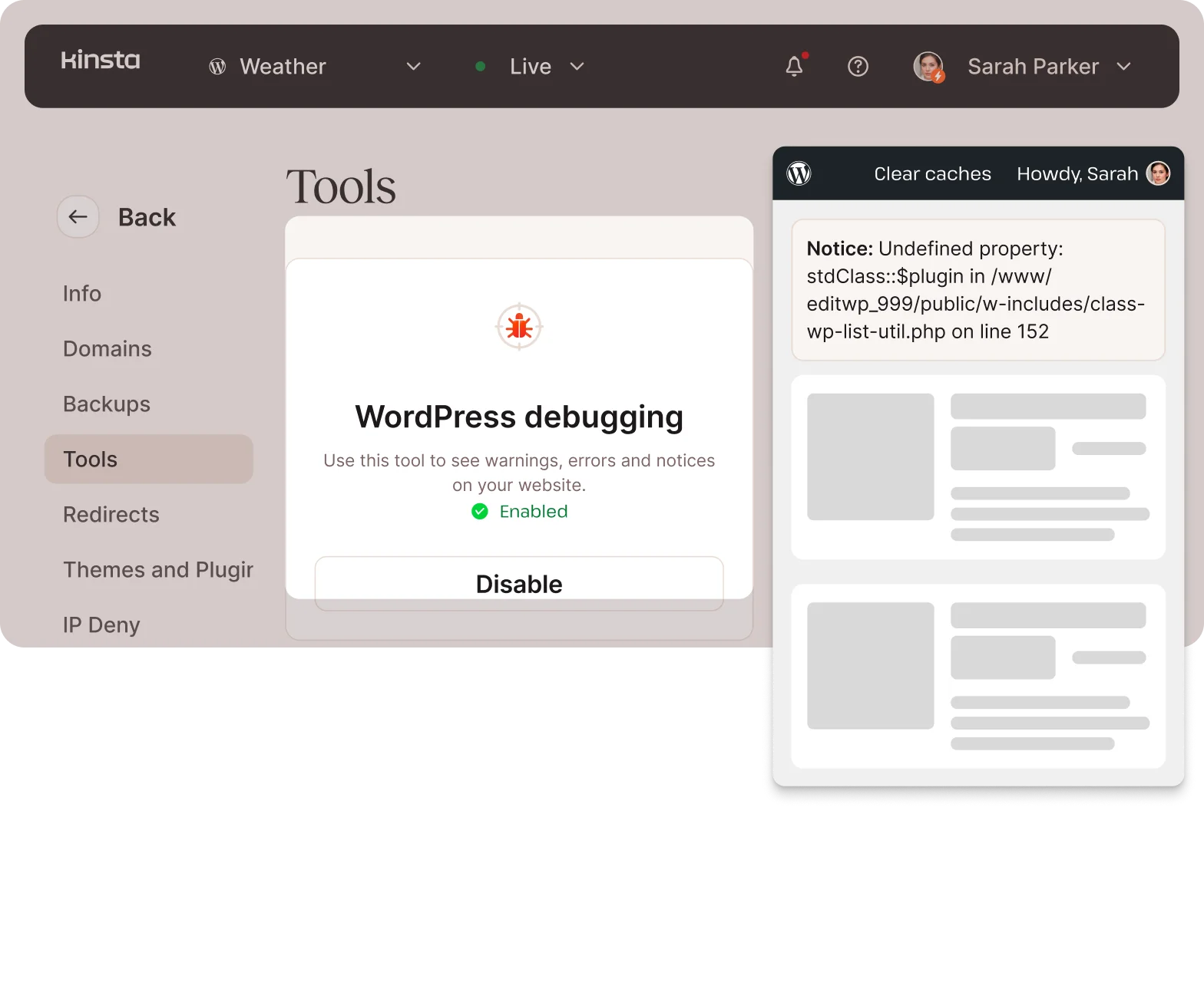 - Enable WordPress debugging mode with a single click