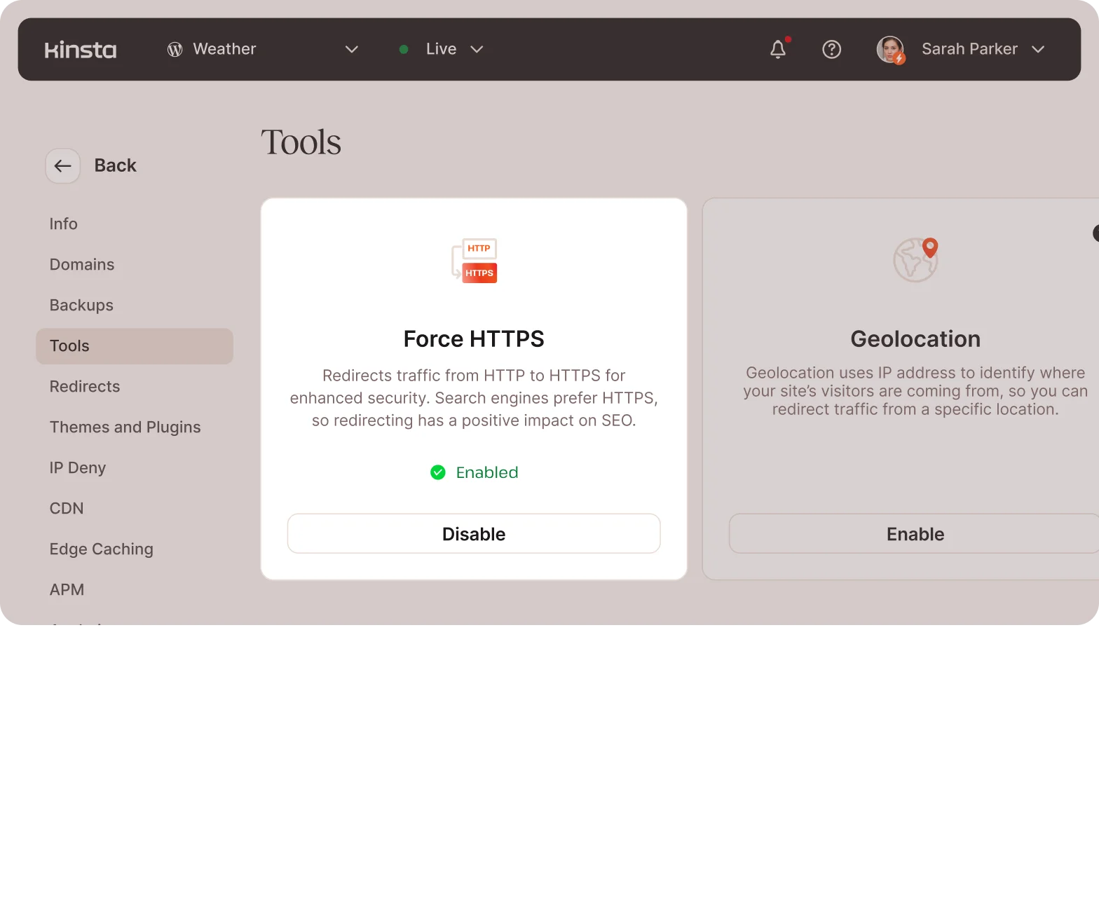 MyKinsta is the control center for your network. Track traffic, generate SSL certificates, configure speed and security settings, and more. Get all the tools you need in one place.