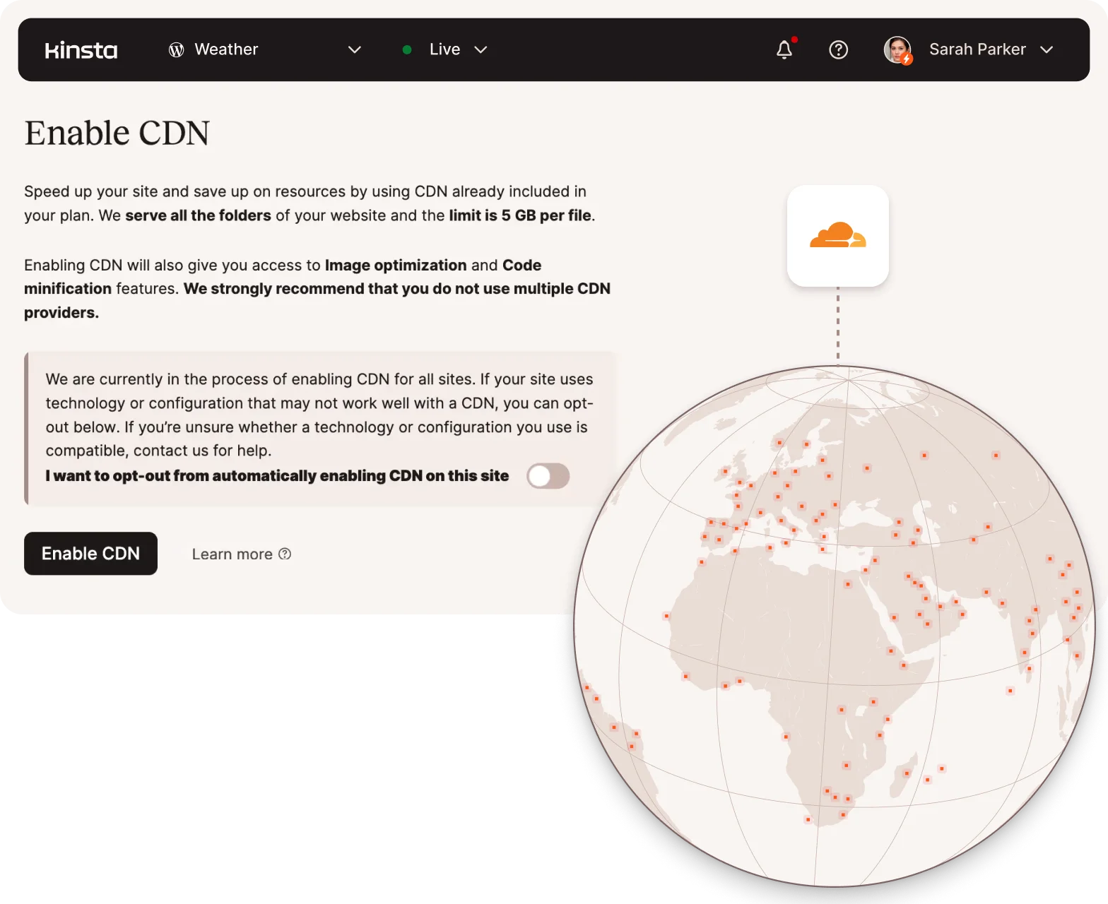 All plans include the Kinsta CDN, a high-performance content delivery network powered by Cloudflare with 300+ POPs to speed up the delivery of your assets around the globe. We include free bandwidth across all of our plans.