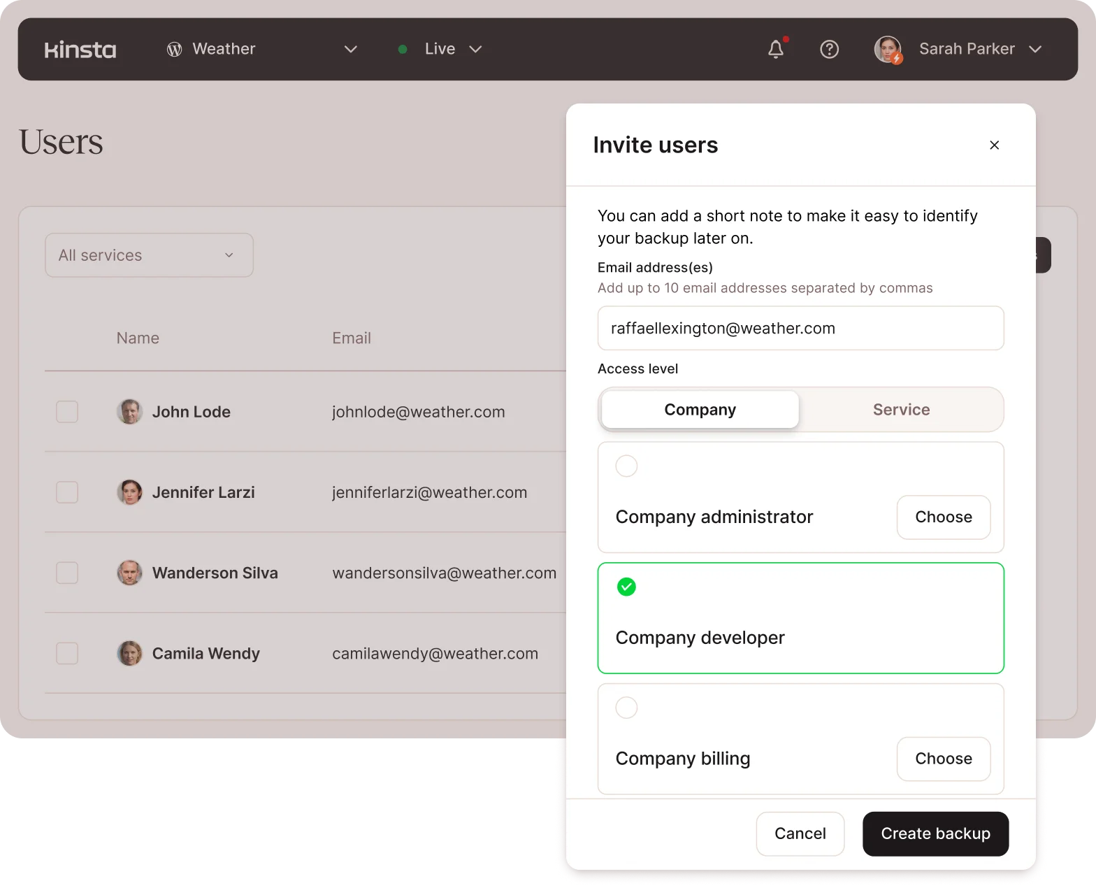 Add unlimited users and configure their access levels with our multi-user feature. Grant access at different levels, whether to all the sites in your network or a specific area like “billing.” Define MyKinsta user roles at the company and site levels.