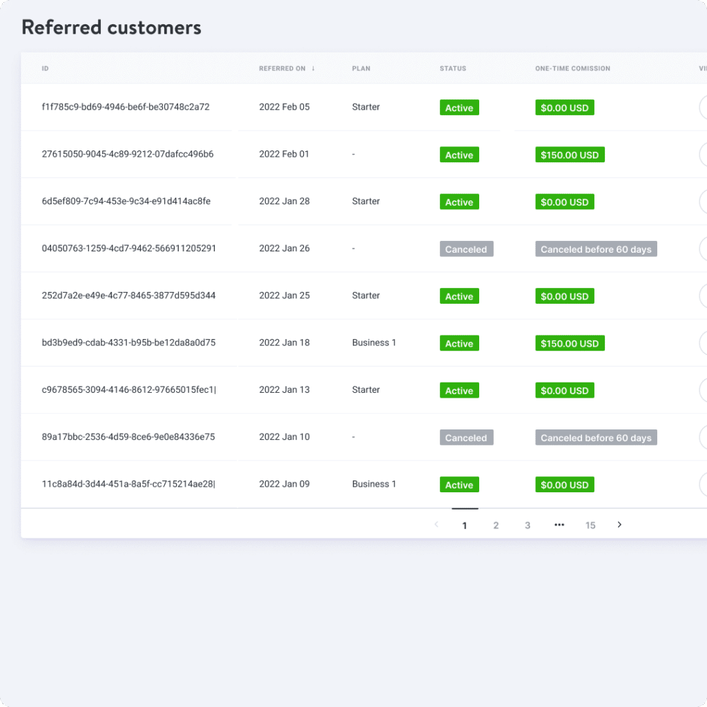 View detailed subscription data for each referral, including when they complete actions such as upgrading, downgrading, or canceling. See exactly when you’ll get paid for each referral and check when your one-time and recurring commissions are approved.