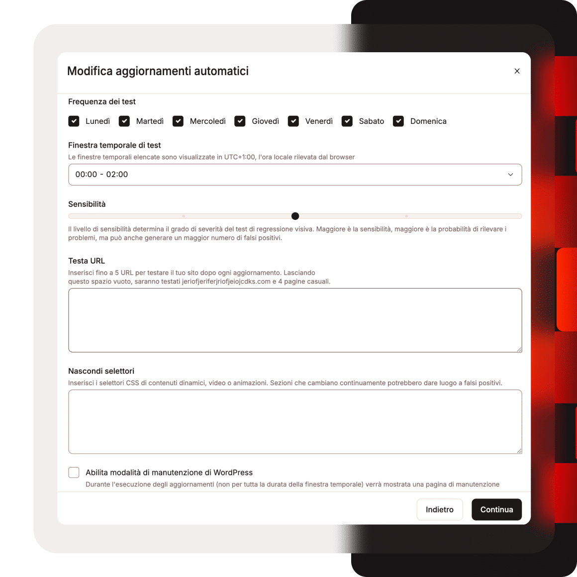 Gli Aggiornamenti Automatici Kinsta eseguono gli aggiornamenti dei plugin e dei temi disponibili e ne verificano i risultati mediante test di regressione visiva. Se qualcosa va storto, il sistema ripristina automaticamente un backup sicuro.