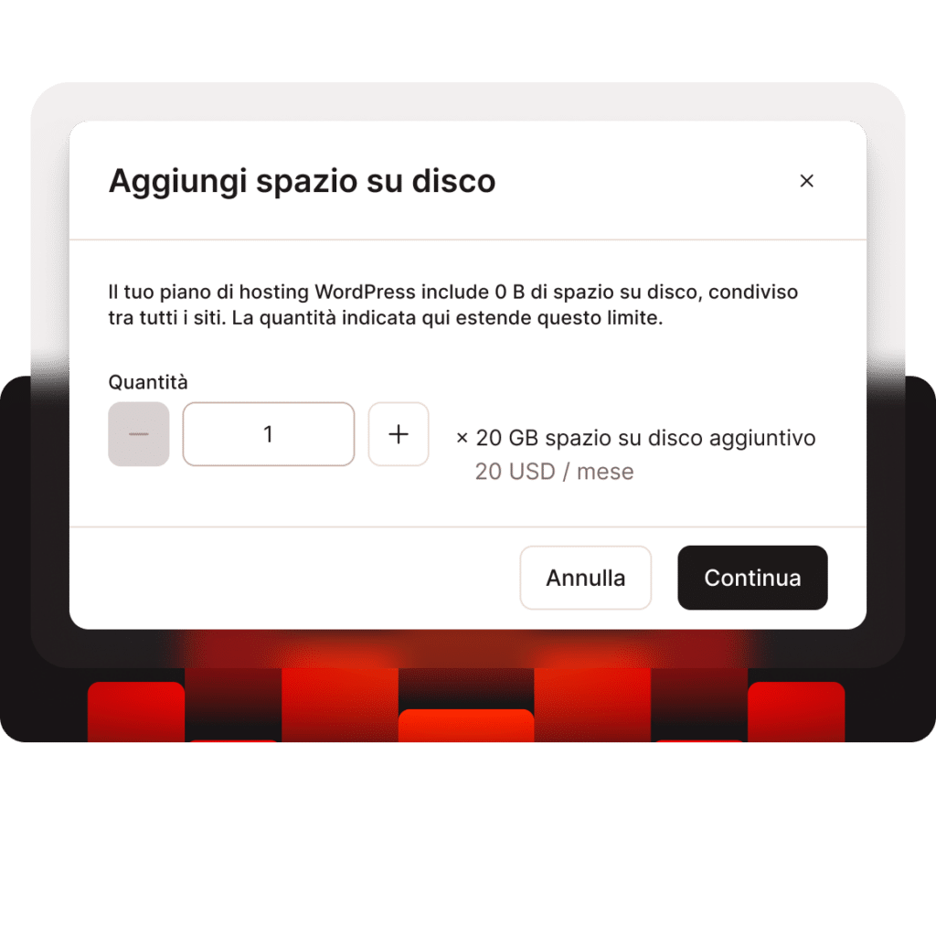 Per i siti di grandi dimensioni con molti file o immagini, il nostro add-on mensile aumenterà lo spazio su disco del tuo piano.