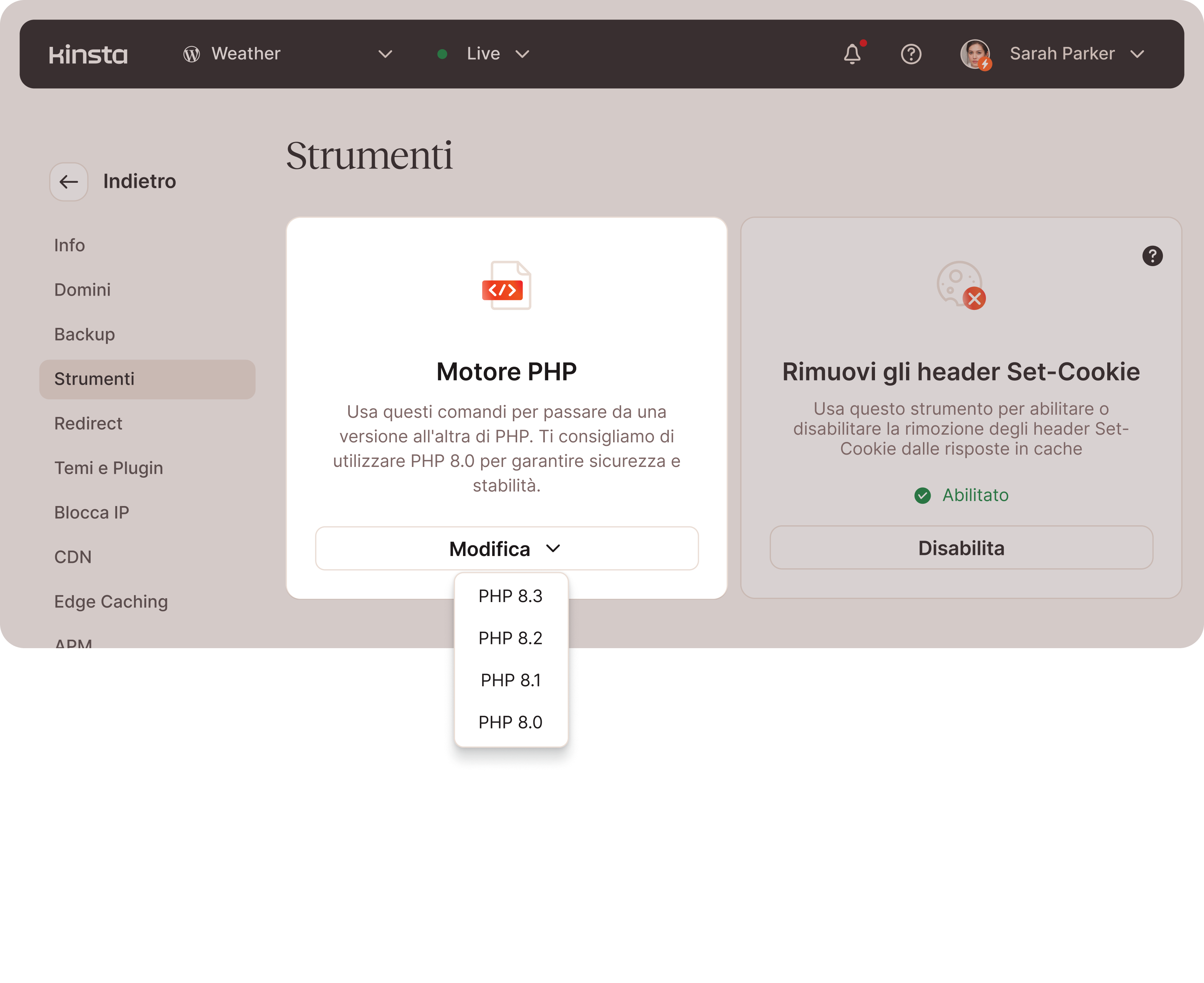 - Selettore di versione PHP per ogni sito