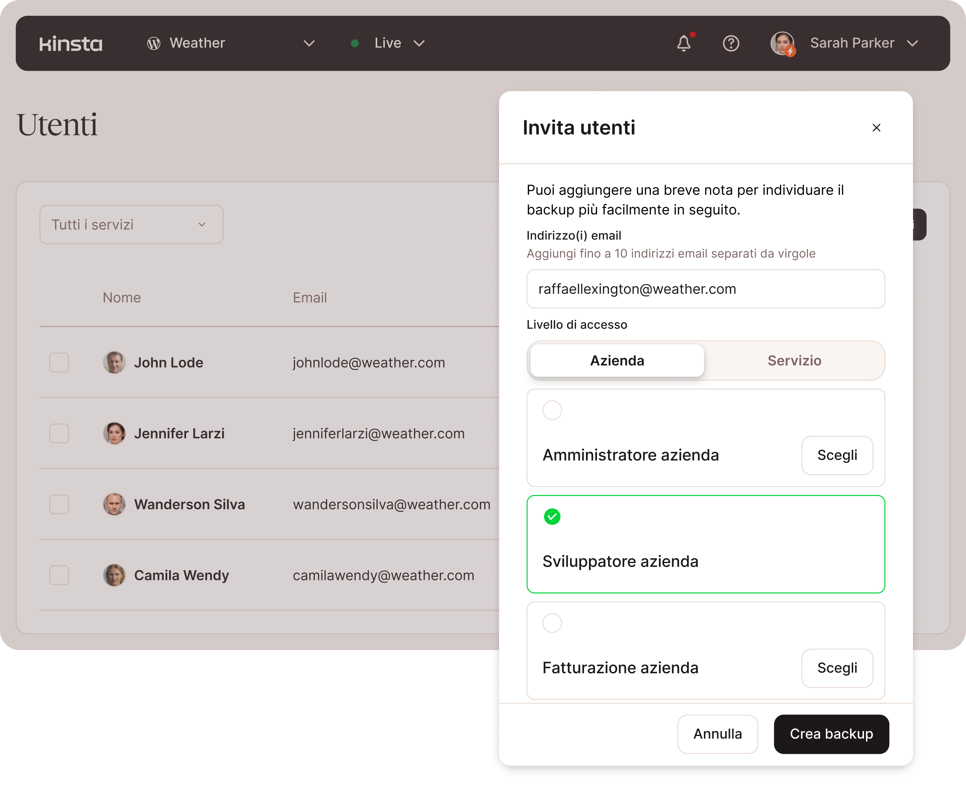 Aggiungi un numero illimitato di utenti e configura i livelli di accesso con le funzionalità multiutente. Concedi l’accesso a diversi livelli, a tutti i siti del network o a un’area specifica, come quella della “fatturazione”. Definisci i ruoli degli utenti di MyKinsta a livello di azienda e di sito.